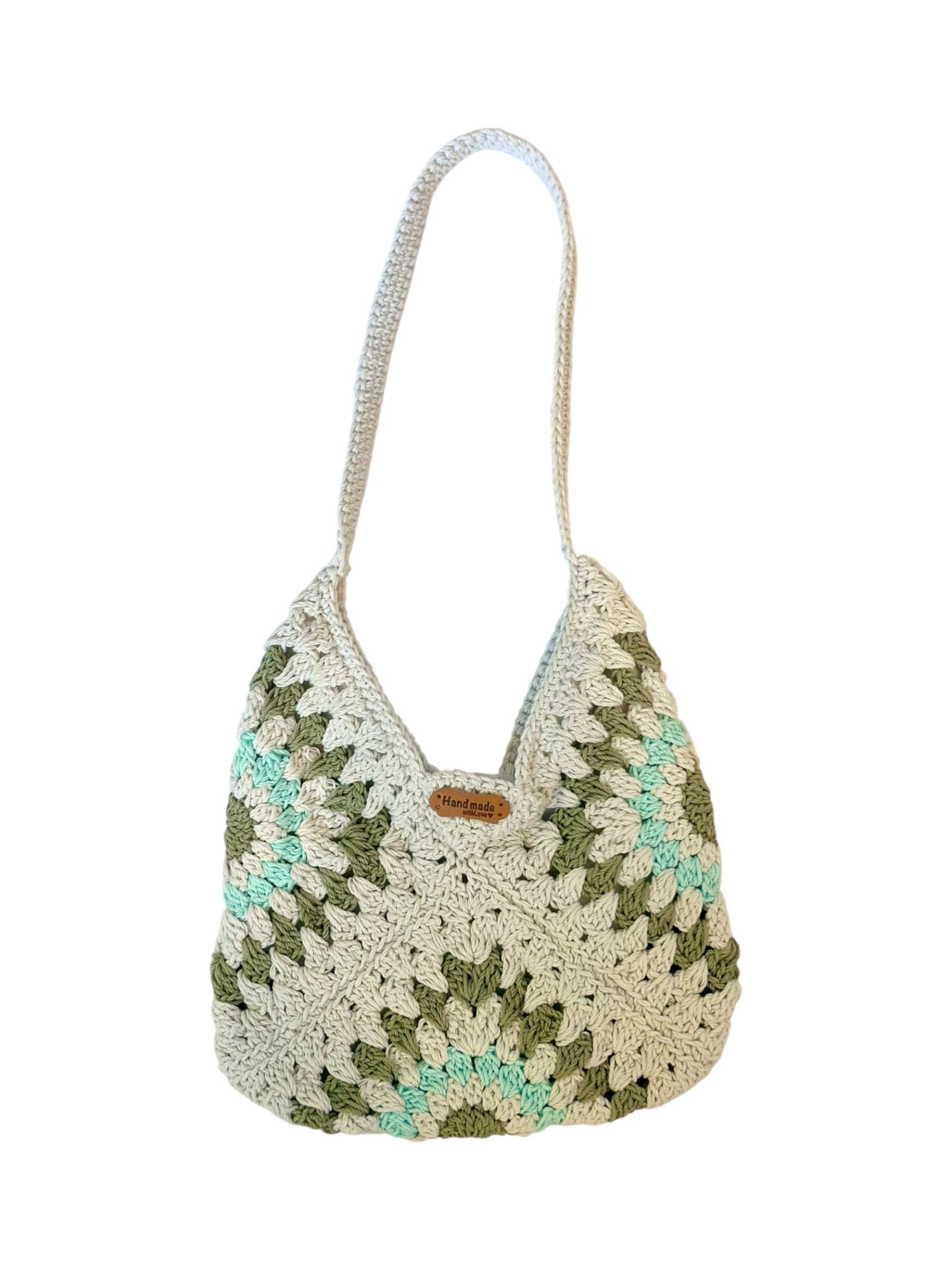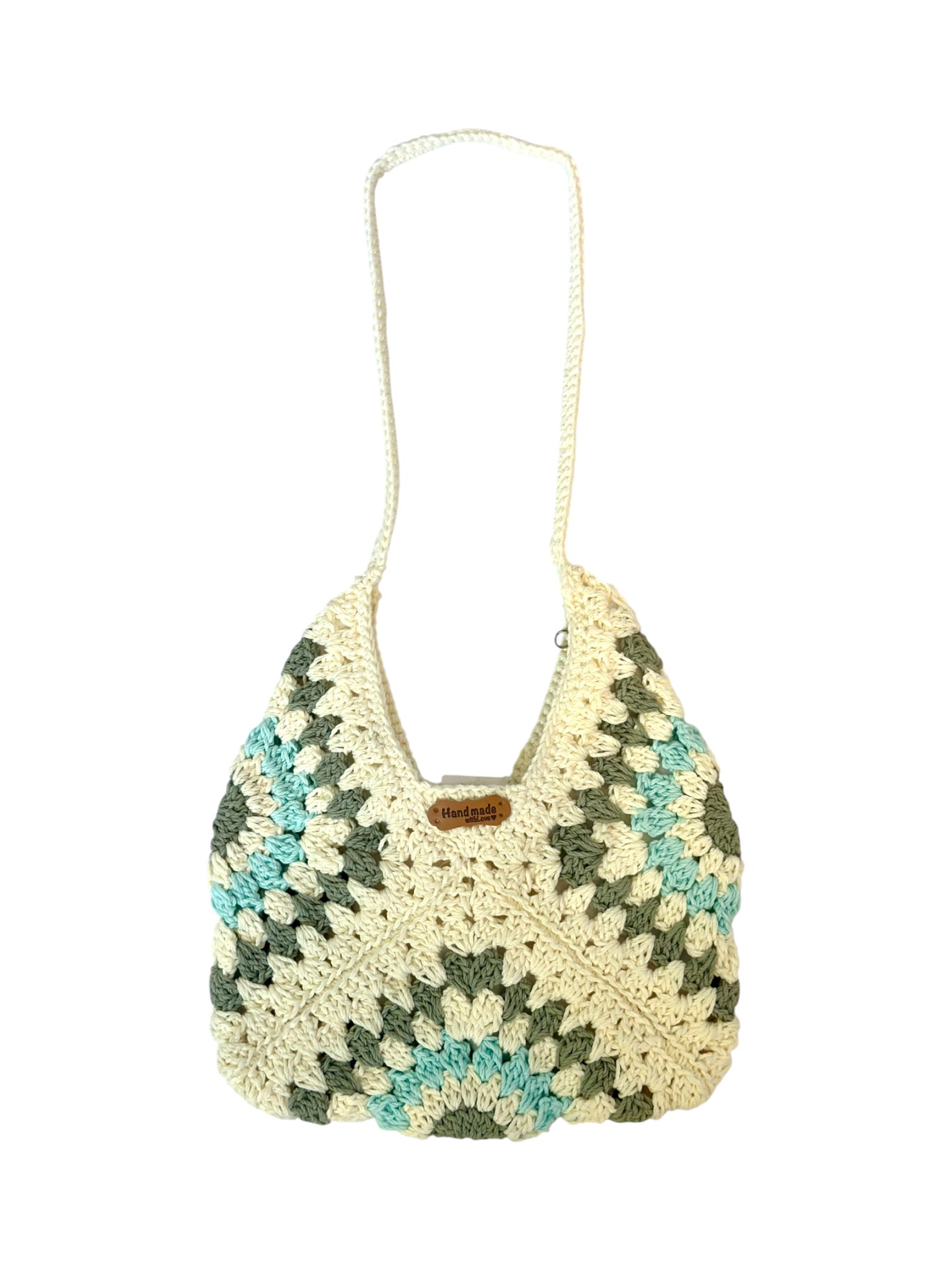 Là chiếc túi đan thủ công (móc/crochet) nhỏ gọn, có quai đeo dệt bằng sợi màu trắng, với thân túi có họa tiết hình mặt trời (hoặc hoa) màu vàng, xanh lá và nâu trên nề