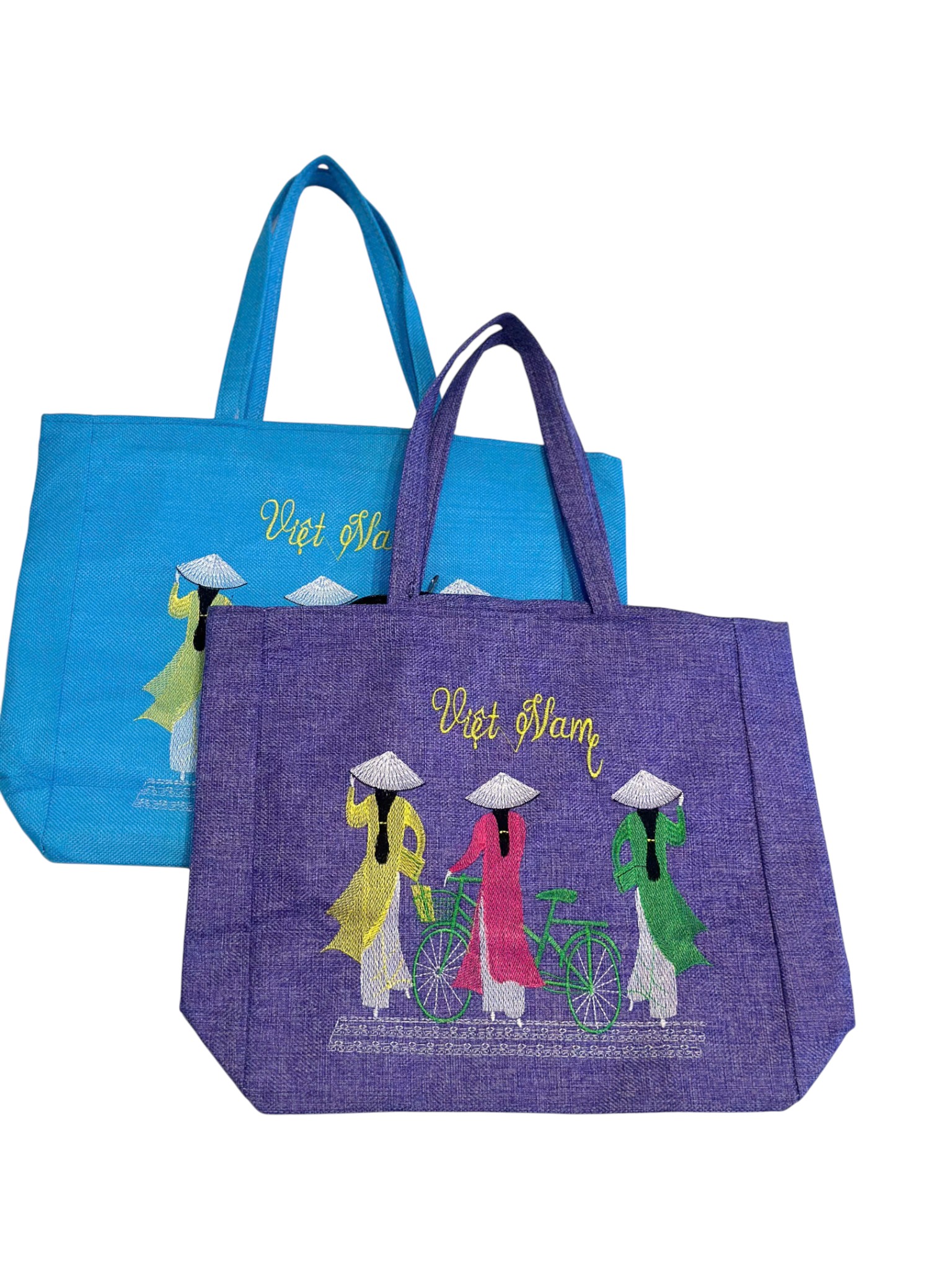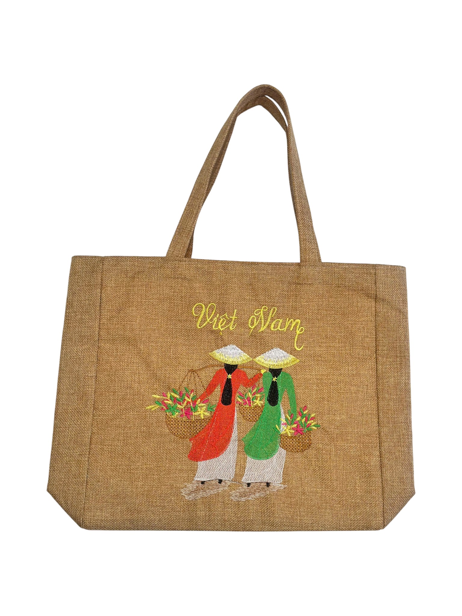 Là chiếc túi vải bố/jute cỡ lớn, có quai xách màu đen hoặc màu be, được trang trí bằng họa tiết thêu hoặc in hình các cô gái Việt Nam mặc áo dài, nón lá (ví dụ: gánh hàng hoa hoặc đạp xe), với dòng chữ "Việt Nam" nổi bật, thích hợp để du lịch hoặc đựng đồ.