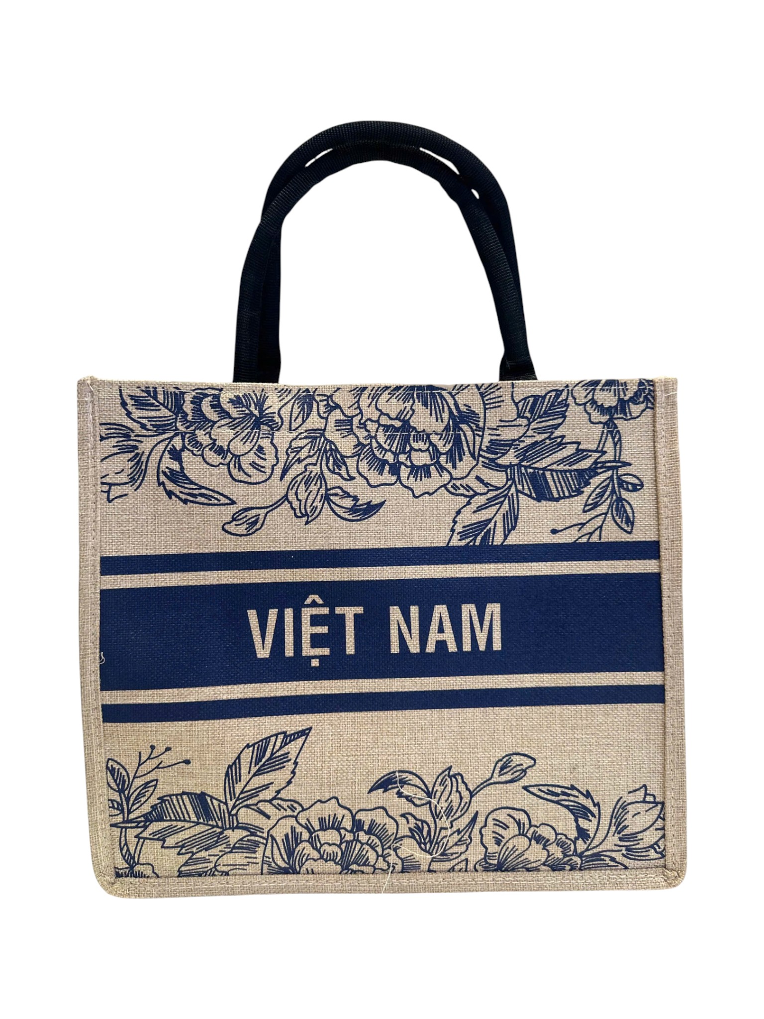Là một chiếc túi vải bố (hoặc túi canvas/jute) hình hộp chữ nhật lớn, có khóa kéo (giả định) ở miệng túi, màu be tự nhiên với họa tiết hoa văn dân tộc và in chữ "VIỆT NAM" màu xanh đậm nổi bật, thường dùng cho du lịch hoặc đựng đồ đa năng.