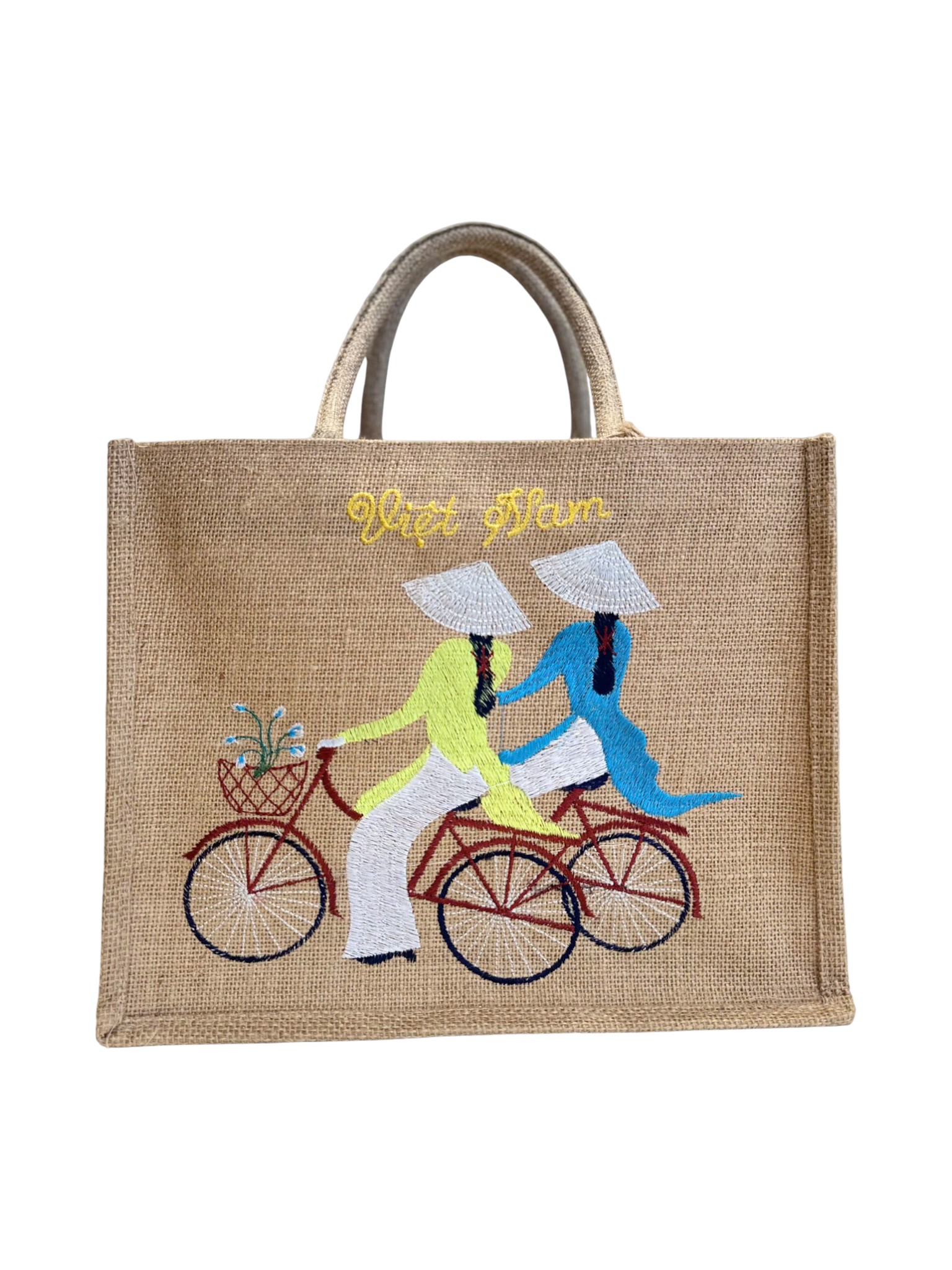 Là một chiếc túi vải bố (hoặc jute) có kích thước nhỏ gọn, quai xách màu be, được thêu họa tiết hình hai cô gái mặc áo dài và nón lá đang đạp xe với dòng chữ "Việt Nam" màu vàng nổi bật.