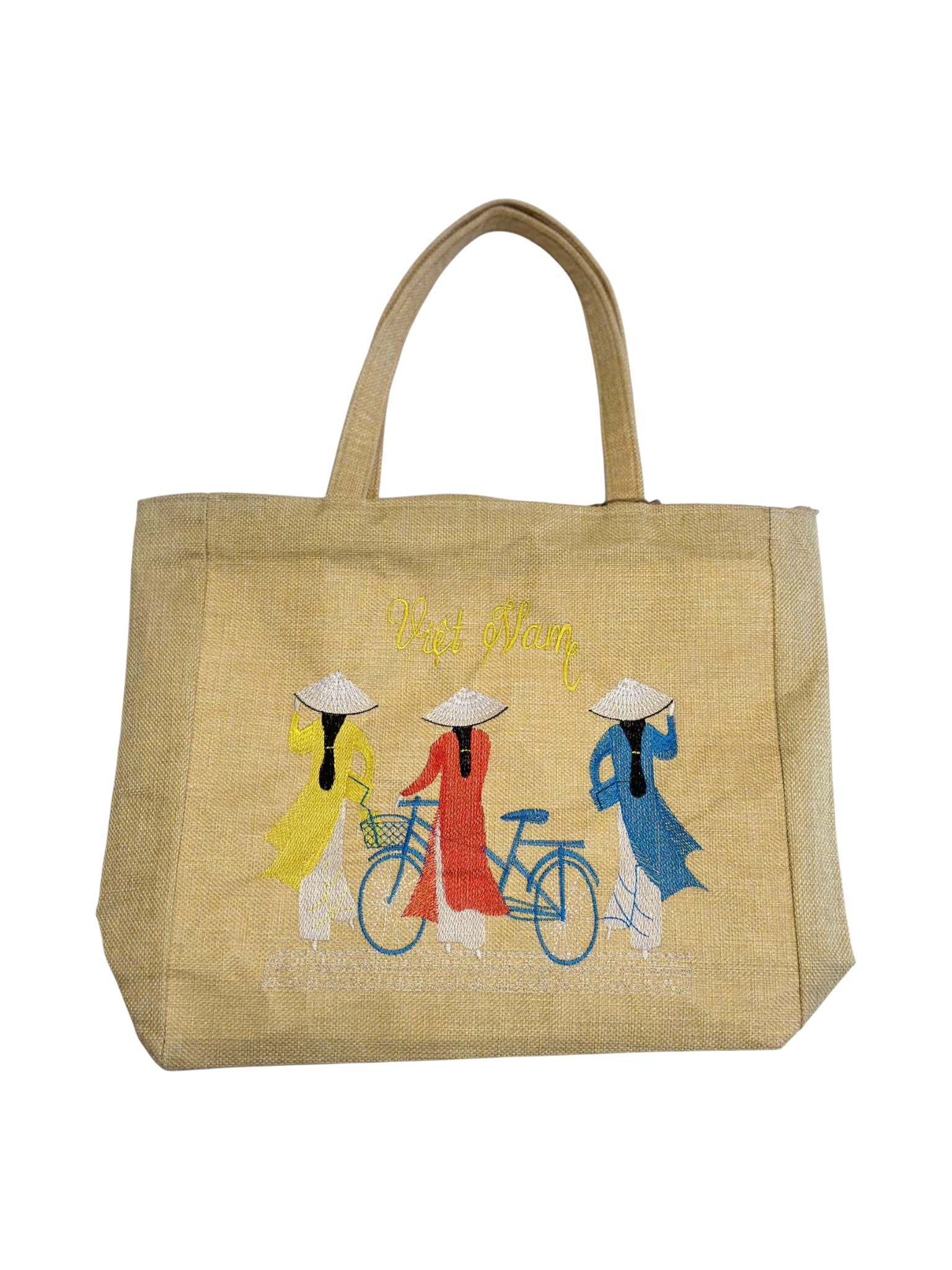 Là chiếc túi vải bố/jute cỡ lớn, có quai xách màu đen hoặc màu be, được trang trí bằng họa tiết thêu hoặc in hình các cô gái Việt Nam mặc áo dài, nón lá (ví dụ: gánh hàng hoa hoặc đạp xe), với dòng chữ "Việt Nam" nổi bật, thích hợp để du lịch hoặc đựng đồ.