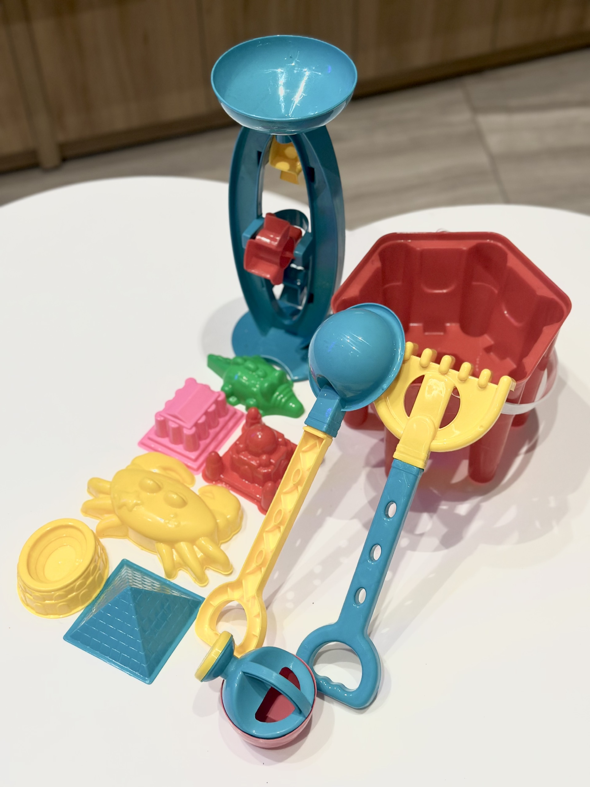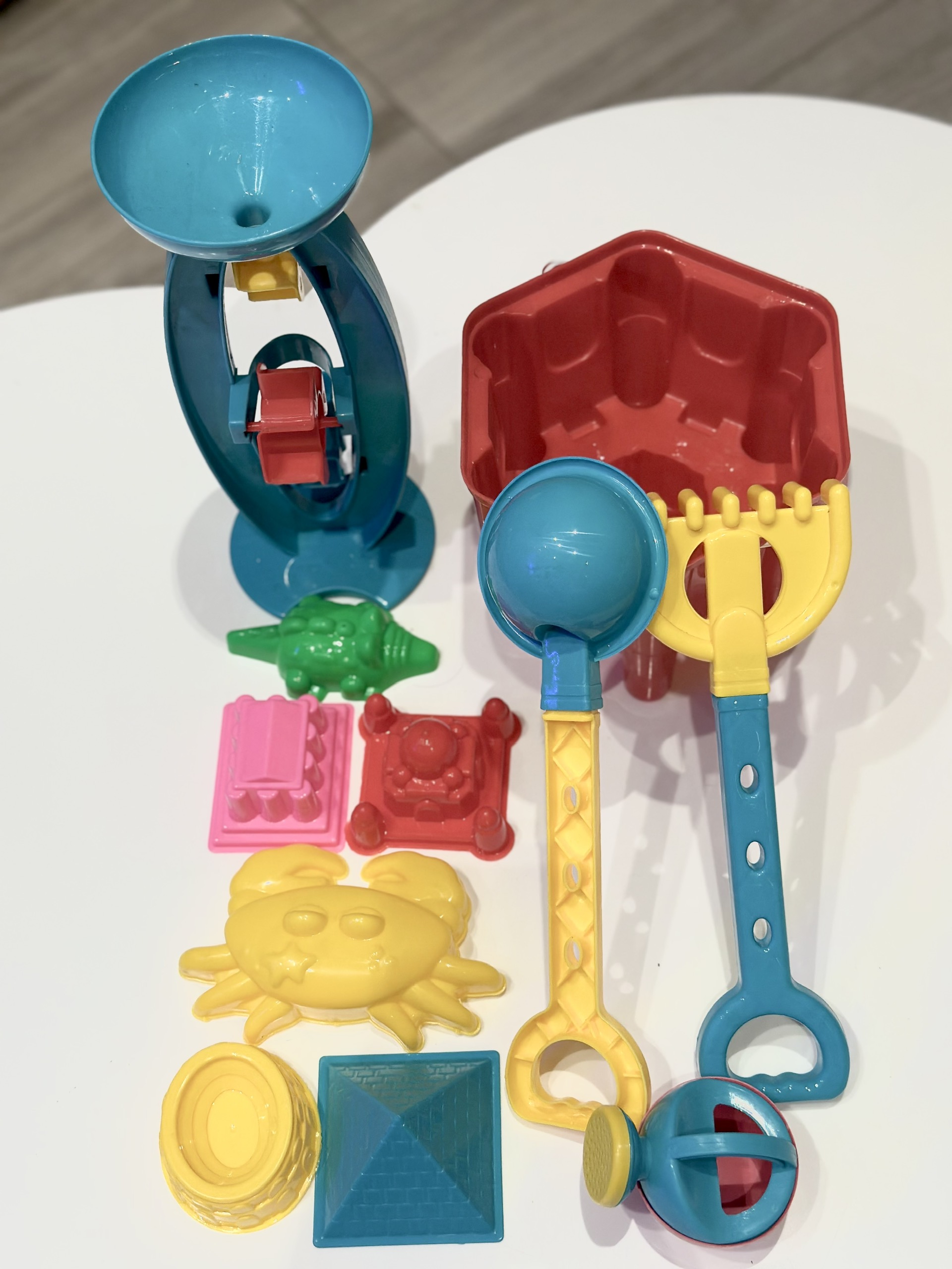 Bộ sản phẩm gồm: 1 xô, 1 cối xay, 1 bình tưới, 1 cào, 1 xúc, 6 khuôn in cát